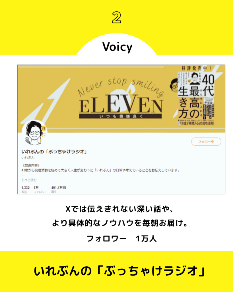 音声プラットフォームVoicyでは、Xでは伝えきれない深い話や、より具体的なノウハウを毎朝お届け。