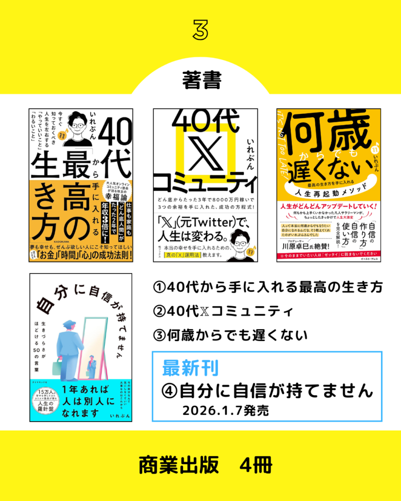 | 48歳 (2026.1現在) | Xフォロワー13.1万人。2026.1月、4冊目の著書『自分に自信が持てません』出版。 |